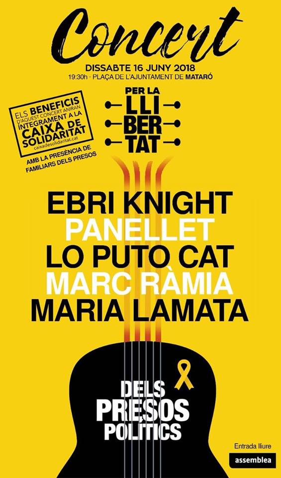 El proper dissabte dia 16 de juny (19:30h), tindrà lloc a darrera de l’Ajuntament el concert organitzat per la ANC Mataró, per la llibertat dels presos polítics. Comptem amb un cartell: Ebri Knight, Panellet, Lo Puto Cat, Marc Ràmia i Maria Lamata.