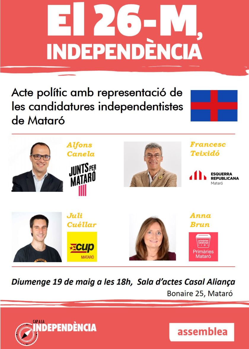 Per això, hem organitzat un acte polític amb representació de les candidatures independentistes de Mataró. Comptarem amb la presència de: