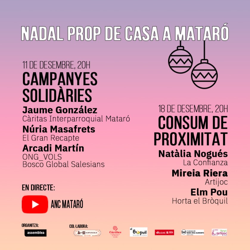 A Assemblea Mataró llancem la campanya “Nadal prop de casa a Mataró”. En col·laboració amb entitats del tercer sector i amb petits comerços, us volem donar a conèixer quines són les iniciatives solidàries a la ciutat i els beneficis del consum de proximitat. Malgrat les enormes dificultats i complexitats dels temps que ens ha tocat viure, volem que tots i totes puguem celebrar el Nadal. Ajuda’ns a fer ho possible!