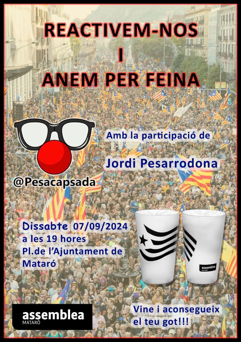 Dissabte, 7 de setembre, a la plaça de l’Ajuntament, l’Assemblea de Mataró convoca a reprendre l’activitat i preparar-nos per a l’11S. Comptarem amb la participació de Jordi Pesarrodona, secretari nacional de l’ANC i podrem adquirir la samarreta d’enguany, el got de l’AT de Mataró i el tiquet per al bus de l’11S. Hi haurà pica-pica.